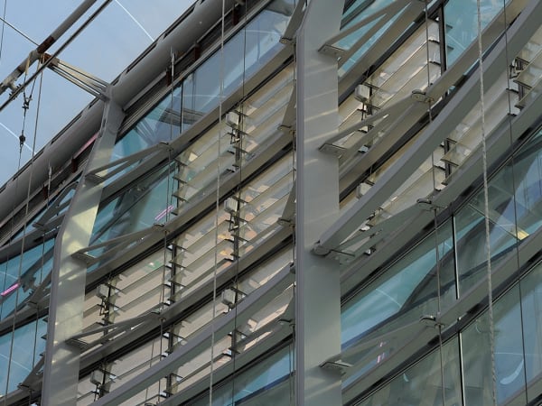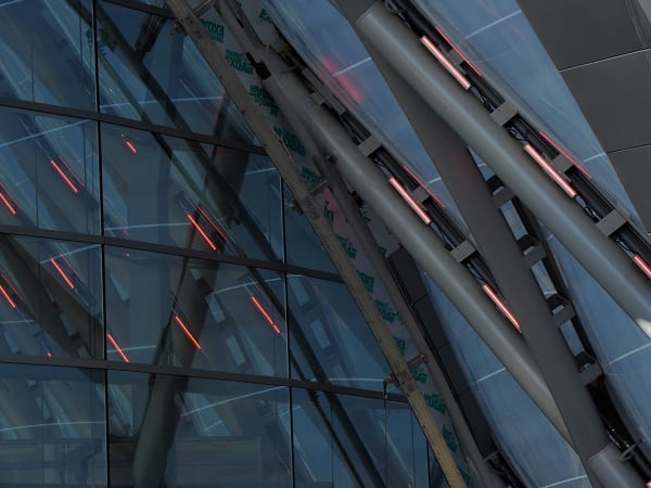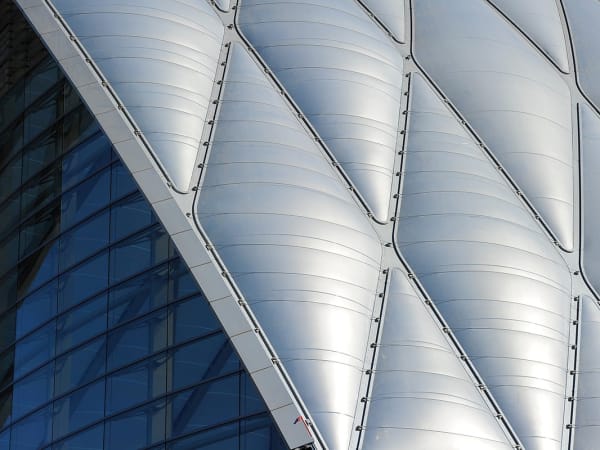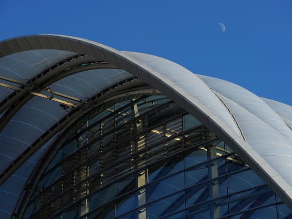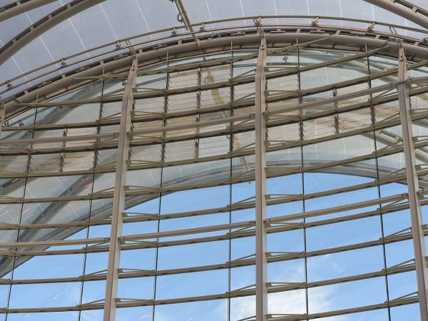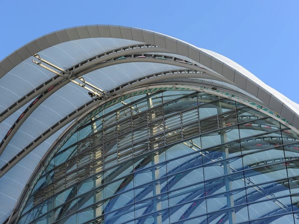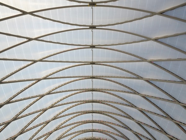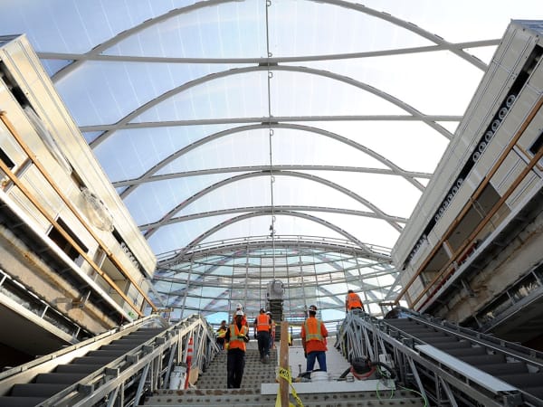 ARTIC's compound curved terminal shell features a 200,000 square-foot ethylene tetrafluoroethylene (ETFE) roof system stretched across a diamond-shaped metal grid (diagrid) that is supported by a structural steel frame.