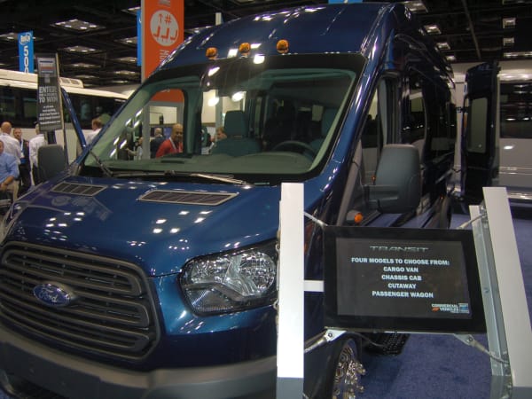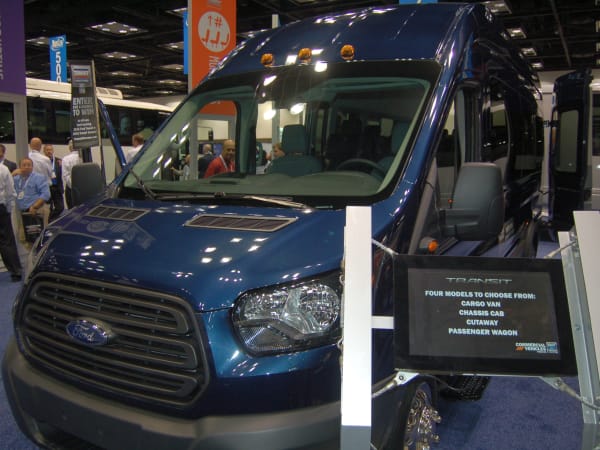 Ford featured three vehicles on the show floor, including the 2015 Ford Transit, which is available in three roof heights, two wheelbases and three lengths. The Transit on the show floor had room for 13 passengers, with room for luggage in the rear.