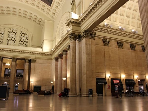 A glimpse of Chicago's Union Station, the third busiest rail station in the U.S. after New York's Grand Central and Penn Station. It is the city's primary terminal for commuter trains (Amtrak and Metra).