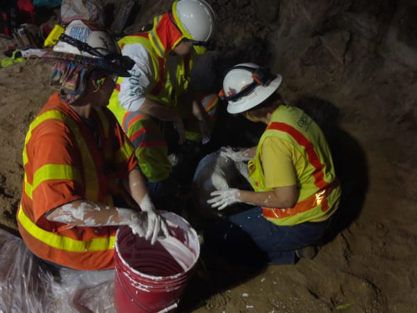 Putting the finds in plaster so they can be safely removed from the construction site. Photo: Metro