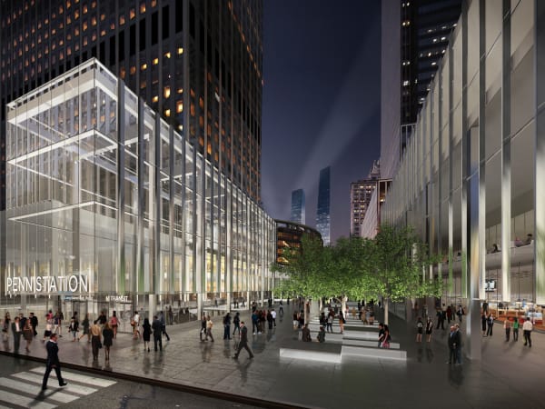 Empire Station Complex: 33rd Street Entrance by Night - Close 33rd Street and use skylights and new entrance to bring natural light to the concourse below.