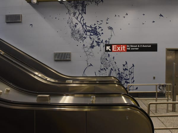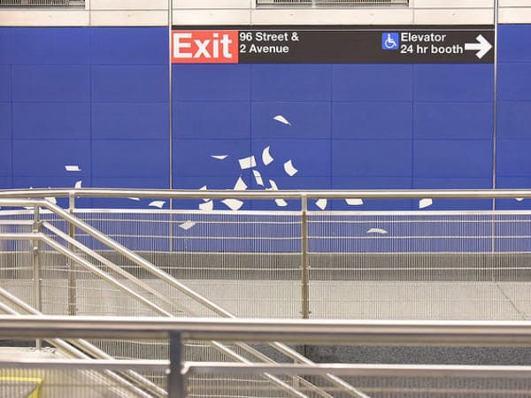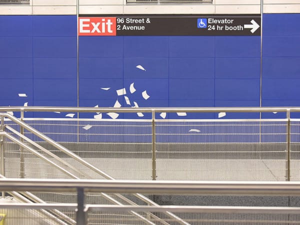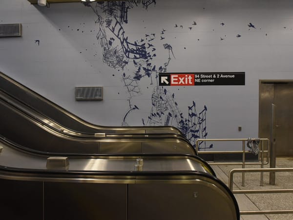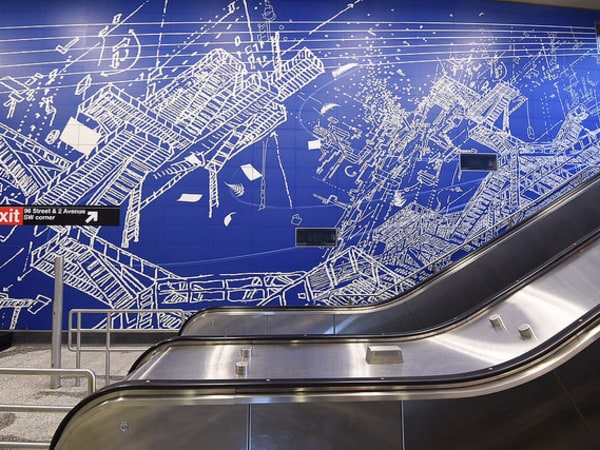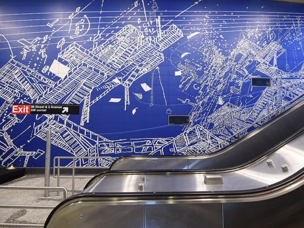 The artwork that visitors will see at the 96th Street Station features familiar objects – sheets of paper, scaffolding, birds, trees, and foliage – caught up in a whirlwind velocity that picks up speed and intensity as the composition unfolds throughout the station. Called “Blueprint for a Landscape,” the installation by Sarah Sze is applied directly to nearly 4,300 unique porcelain wall tiles, spanning approximately 14,000 square feet. Photos: Office of Governor Andrew Cuomo