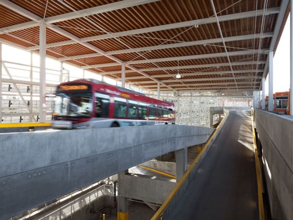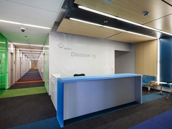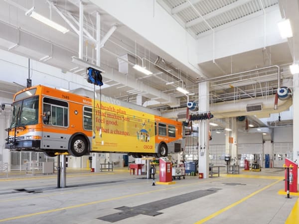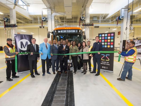 Division 13 bus maintenance bays feature skylights and bright colored paint that provide reflected light, reducing the need for electricity. Division 13 will achieve a Gold Leadership in Energy and Environmental Design (LEED) rating from the US Green Building Council and is Metro's sixth LEED building. Division 13 will serve as a bus maintenance, operations and service facility with a multi-level parking garage that accommodates 200 Compressed Natural Gas (CNG) buses, fueling equipment, transportation offices and support areas. The facility, which incorporates many sustainable design features, received $53.2 million in federal funding toward the $120 million total project cost.