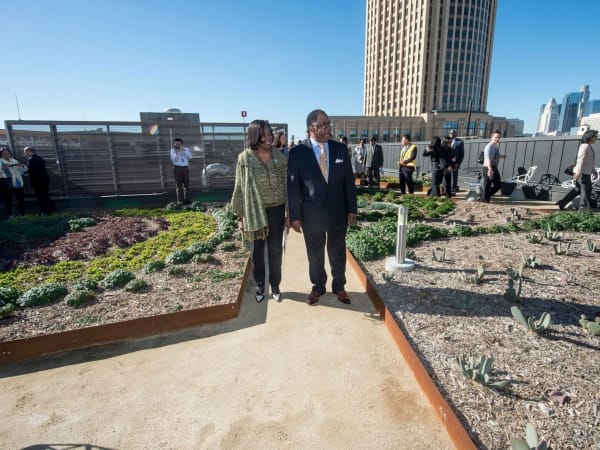 Metro Board Chair Mark Ridley-Thomas and Director Jacquelyn Dupont-Walker tour the rooftop garden. Photo: Gary Leonard for Metro