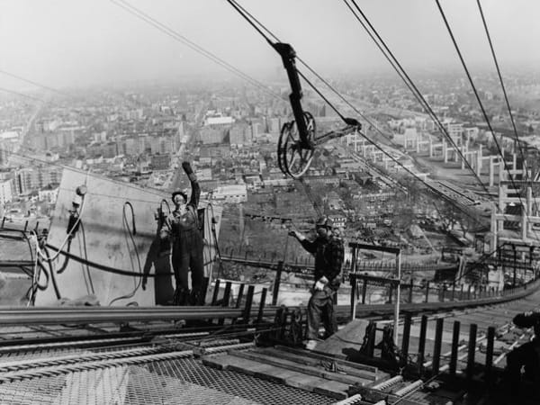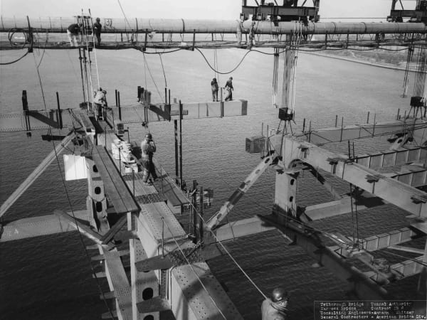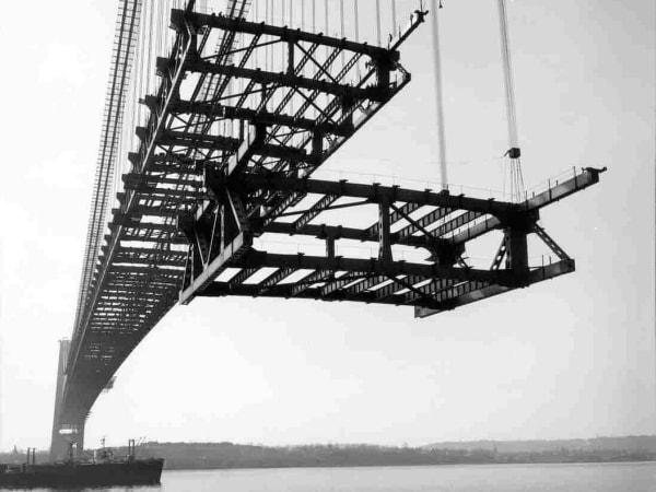 Workers stand on beams high above the Narrows. Photo: Unknown