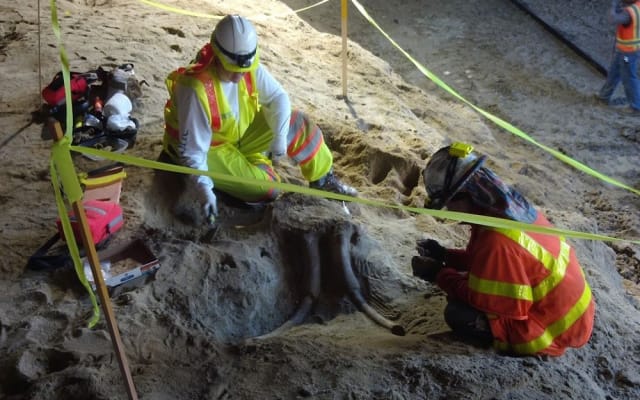 A three-foot section of tusk and mastodon tooth fragments from an adult and a partial skull with tusks of a possibly much younger mammoth or mastodon were discovered in late November during excavation work on Los Angeles Metro's future Wilshire/La Brea Station for the Purple Line Extension subway.