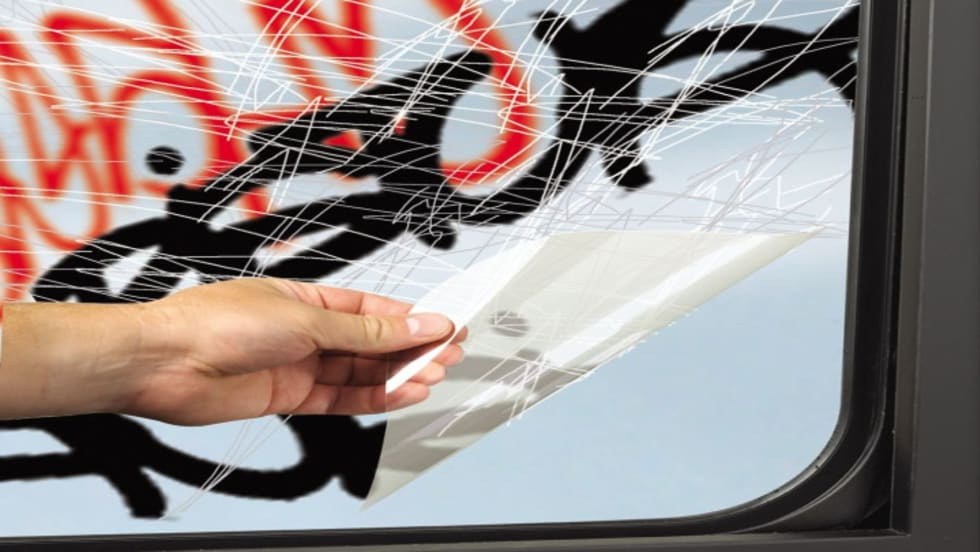 Now you can refresh windows and glass surfaces quickly and easily with 3M’s new four-layer transit film. It’s easy to apply and remove — defacement peels away in seconds.