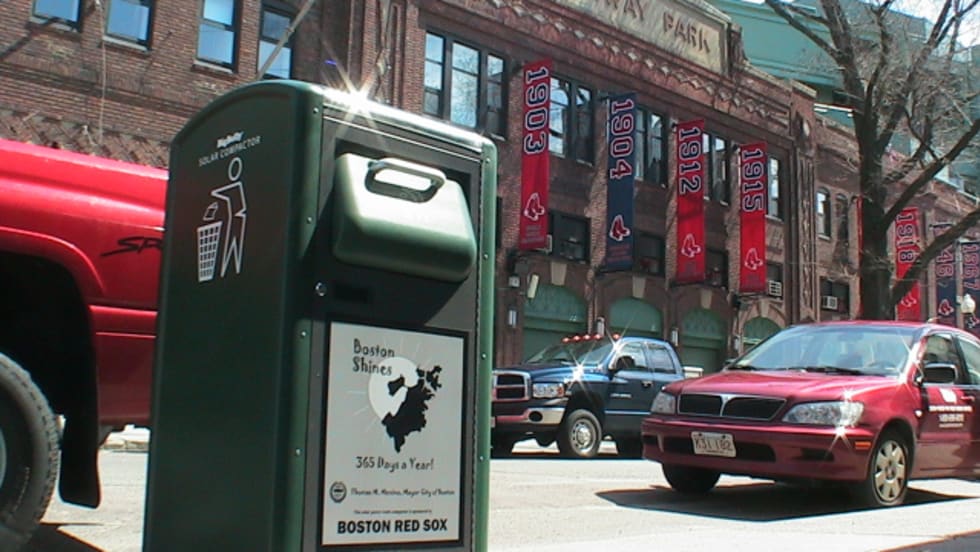 Solar-powered BigBelly® automatically compacts trash, and can hold five times as much trash as an ordinary receptacle.