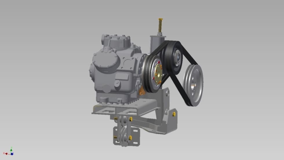 This compressor mount system allows for simple belt tensioning, compressor alignment and reduced vibration, and can be customized for various engine bay layouts and compressors. The major benefits are drastically reduced installation time, reduced belt wear, ease of belt maintenance, and reduced noise and vibration.