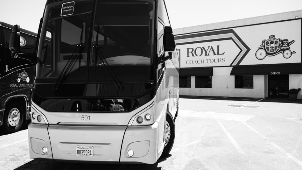 San Jose, Calif.'s Royal Coach Tours' seven vehicles feature its client’s signature specifications, including a silver-painted exterior and high-end interior with black leather seating for 50 with three-point passenger seatbelts.