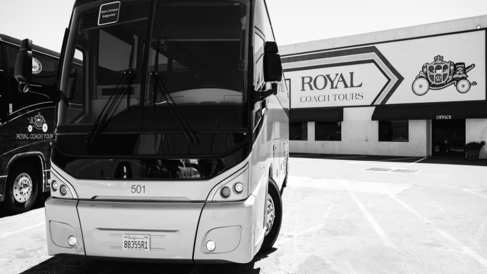 San Jose, Calif.'s Royal Coach Tours' seven vehicles feature its client’s signature specifications, including a silver-painted exterior and high-end interior with black leather seating for 50 with three-point passenger seatbelts.