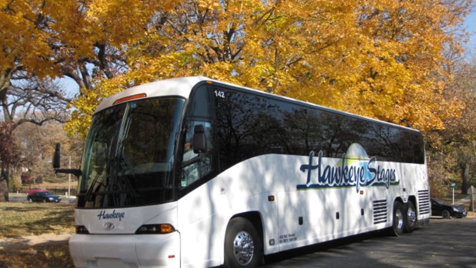 Hawkeye Stages’ new coach features 52 leather passenger seats; a clean-diesel Cummins engine and ZF ASTronic transmission; a high-end Bosch entertainment system with 15-inch video monitors; and 110-volt outlets and Wi-Fi.