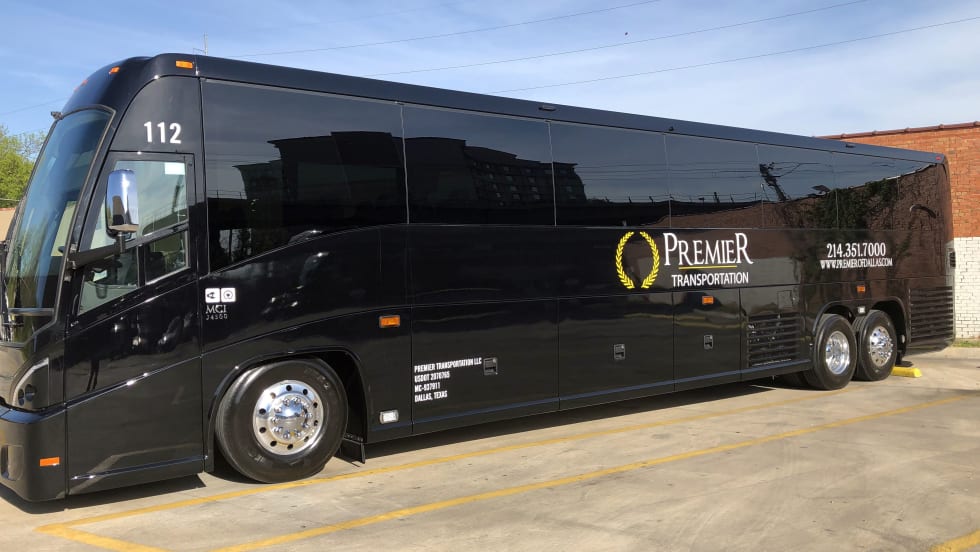 MCI’s Livery Edition adds black leather diamond stitch seating for 56 passengers, woodgrain flooring, and power outlets with USB ports.