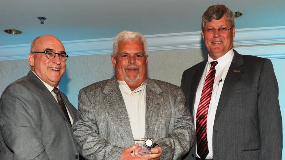 David Cooper of Pacific Coachways Trailways in Garden Grove, Calif., was presented by Bob Crescenzo, VP, safety & loss control, at Lancer Insurance, the awards event sponsor.