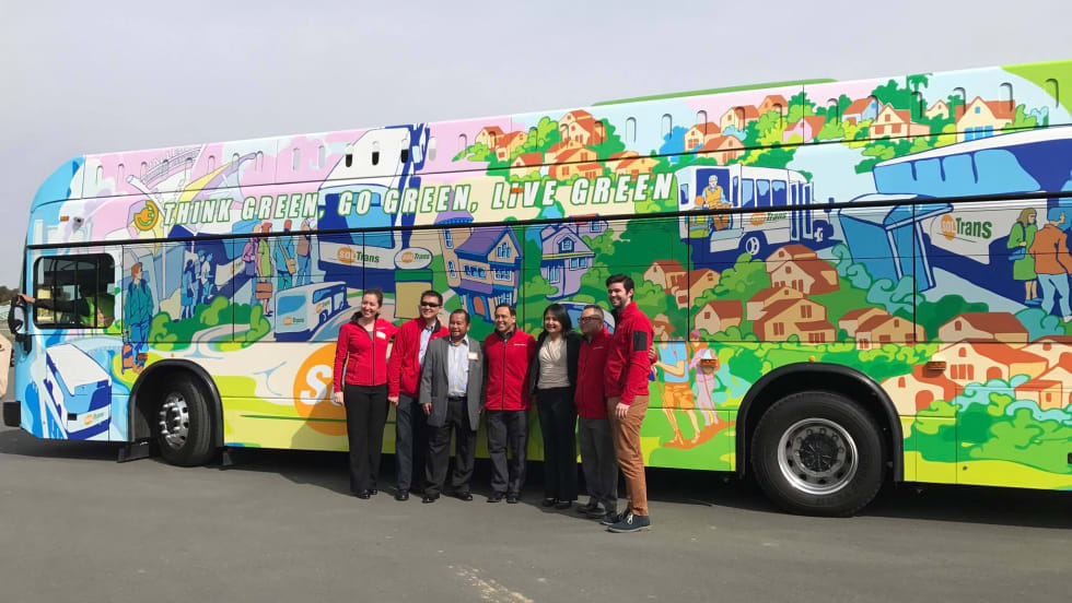 The new buses are decorated with mural-style art depicting the local community, newly commissioned by Vallejo artist Miro del Salazar.