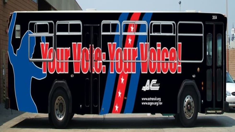 AC Transit and Alameda County are setting out to register as many voters as possible, using a voter registration bus with an eye-catching design. The bus will travel throughout the county to make registering to vote for the November election as easy as possible.