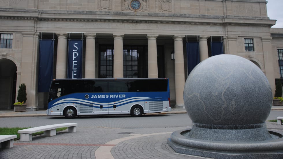 James River's 38-passenger coaches are equipped with Cummins ISL 9L engines driving through Allison B500 transmissions, and have REI Elite Entertainment Systems with 15-inch video monitors, as well as 110-volt and USB outlets.