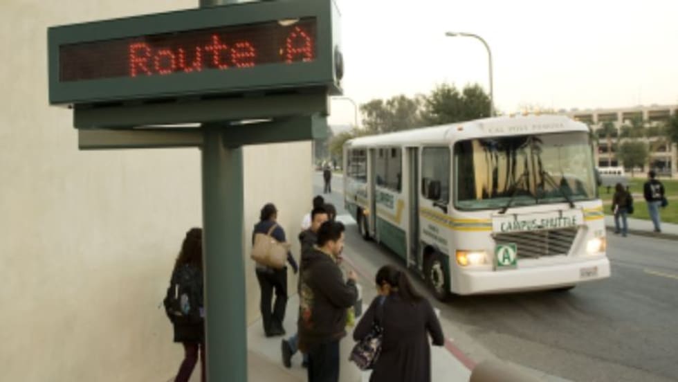 GPS-based system continually updates the location of Cal Poly Pomona’s six shuttle buses, which cover three routes.