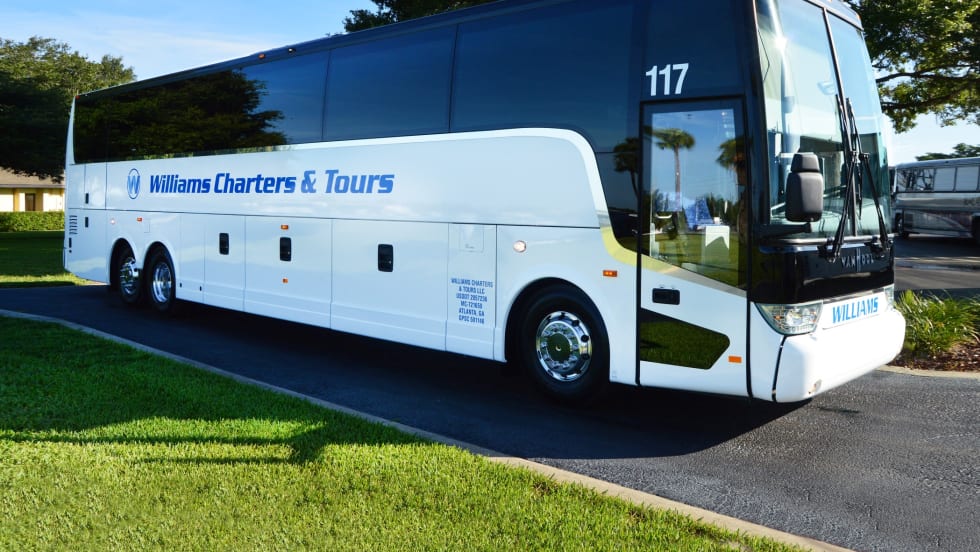 The new Wiliams Charters and Tours coaches include several safety features, including three-point seatbelts, backup cameras, lane departure warning, anti-lock brakes and Smartwave Tire Pressure Monitoring.
