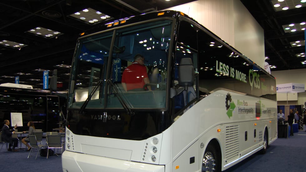 The 56 passenger coaches come with Van Hool's standard safety features including Kidde fire suppression, Smartwave tire monitoring, automatic traction control, lane departure warning and a backup camera.
