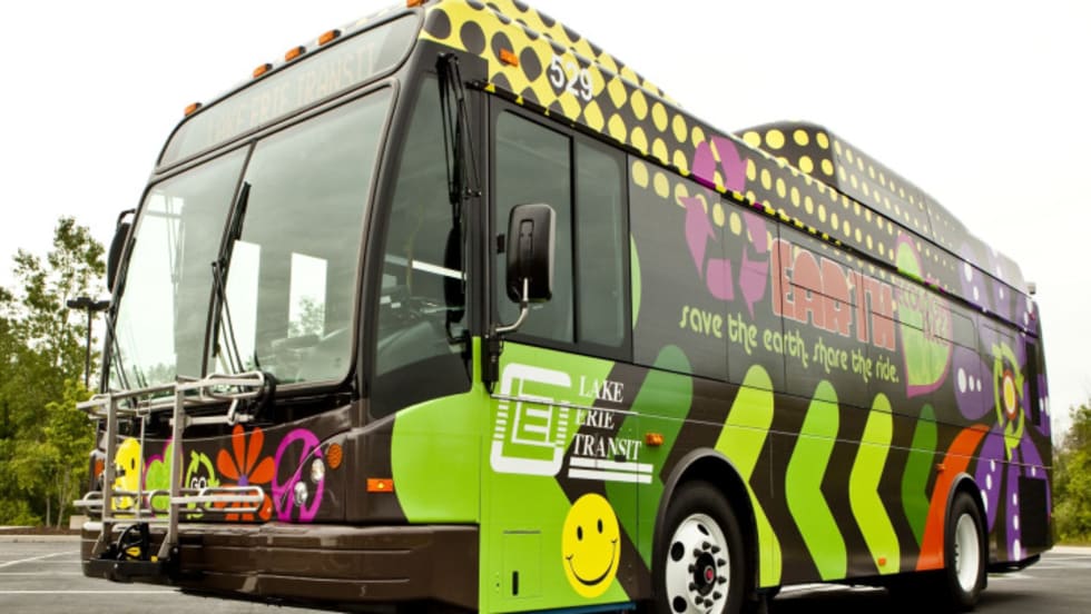 The DesignLine EcoSaver IV bus features a proprietary hybrid-propulsion system that can operate in “zero-emission” mode on battery power up to 40 percent of the time and reduce greenhouse gas emissions up to 70 percent.