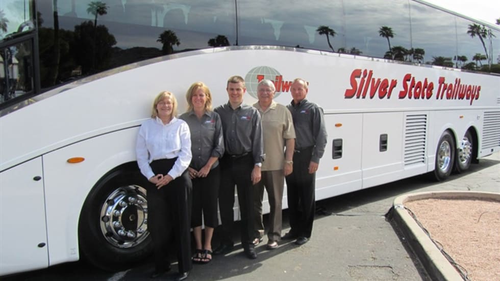 Silver State Coach’s two new 57-passenger Van Hool T2145s feature Elite REI 5 monitor entertainment systems, rear passenger windows, three-point seat belts, passenger shades and curtains, extra handholds and Alcoa Dura Bright aluminum wheels.