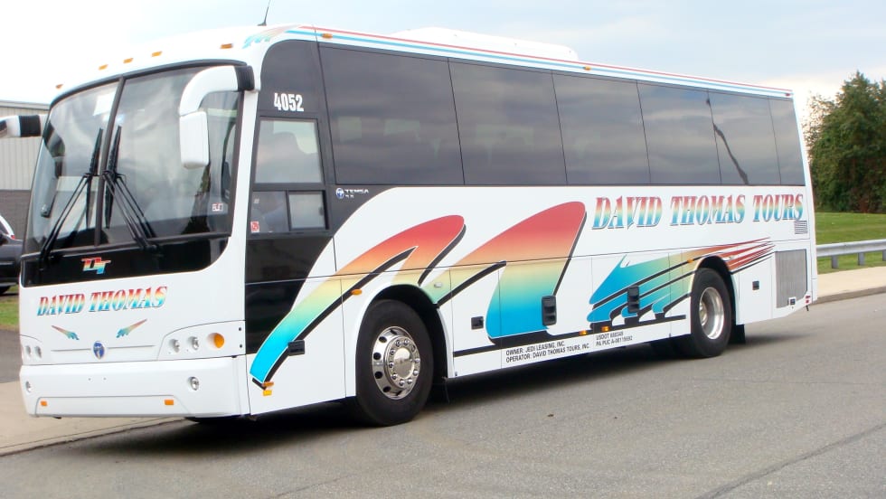 Coaches are equipped with a Cummins ISL 345 HP engine, Allison B500 transmission and three-point seat belts. The David Thomas Tours coach is also equipped with REI audio/video, Alcoa rims and 110-volt plug outlets.