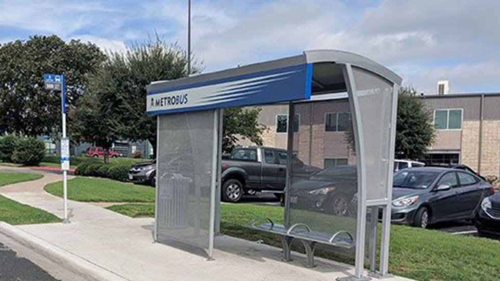 The non-advertising bus stop shelters will be 12 feet in length and provide weather-protecting radius roof and perforated metal walls.