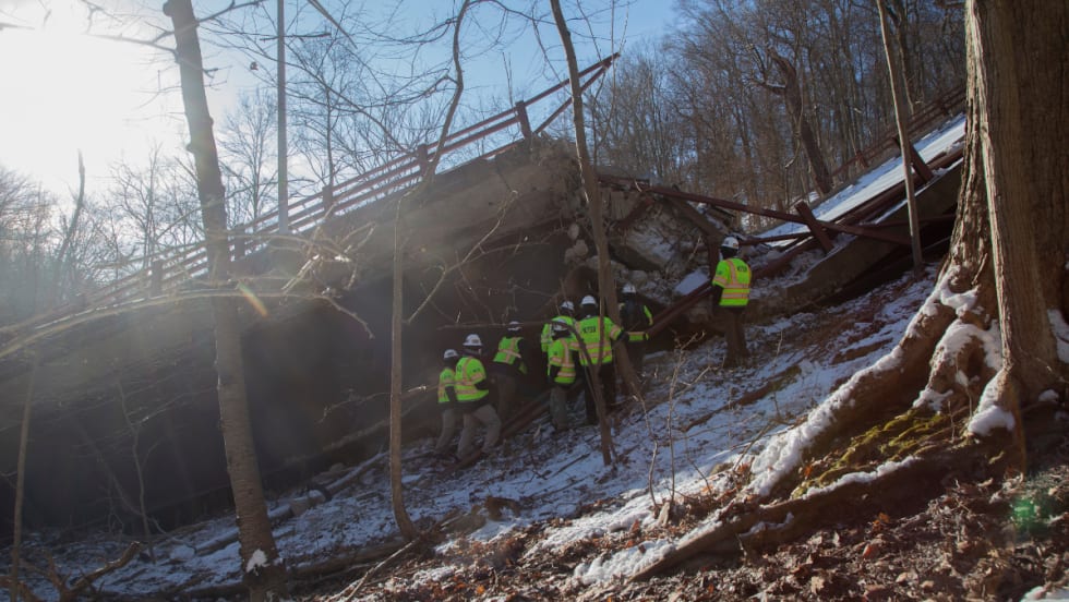 The 447-foot-long bridge experienced a structural failure and fell approximately 100 feet into the park below.