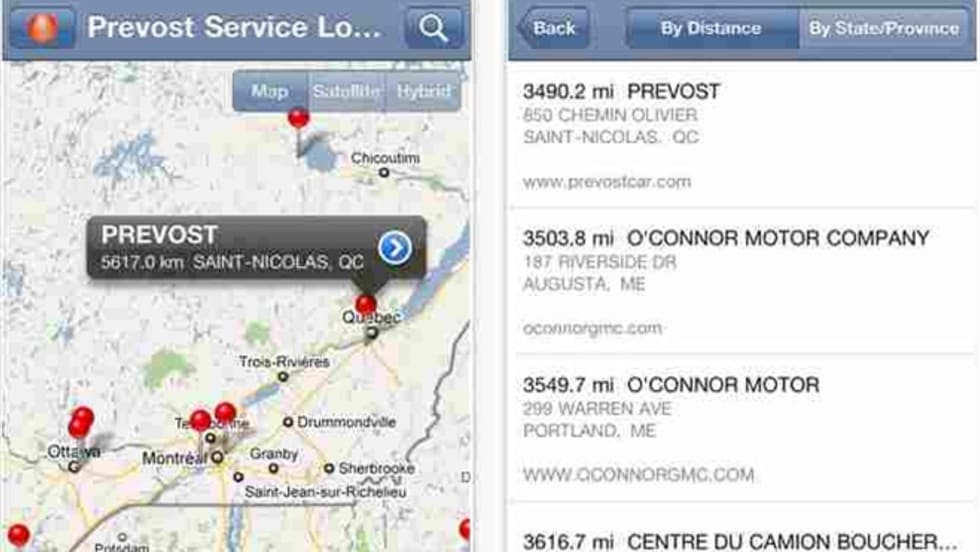 The mobile app features detailed information about the seven Prevost Service Centers and 133 Prevost-certified Service Providers throughout North America. Users can view contact information and tap to automatically dial the phone number, send an e-mail, open the website or view a map showing the service provider’s location and turn-by-turn directions.
