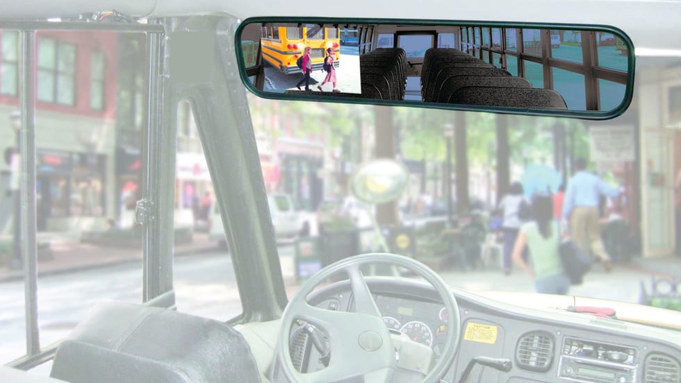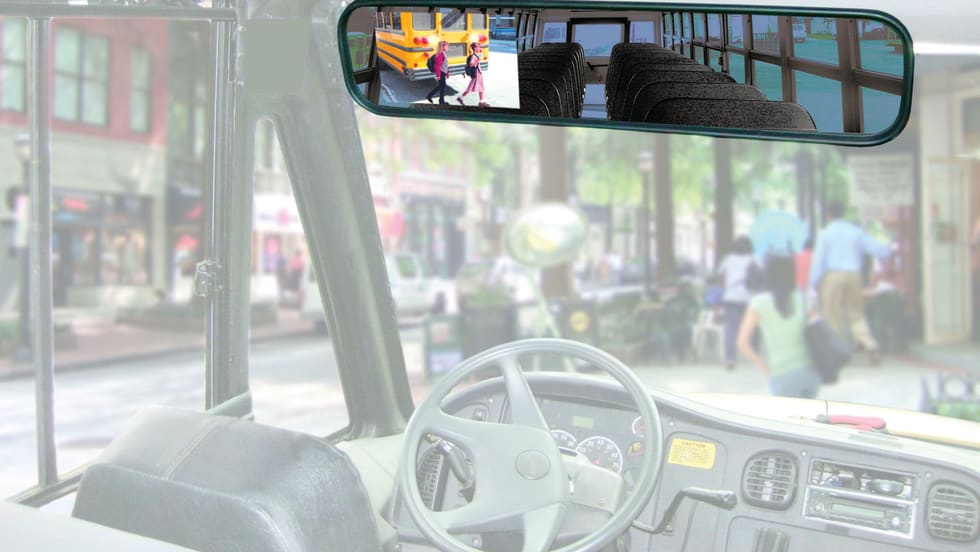 The new Smart-Vision STSK6630 Rearview Mirror/Monitor backup camera system for large buses is a more advanced driver aid that includes a camera mounted on the back of the bus, sending images to a monitor installed inside the rearview mirror.