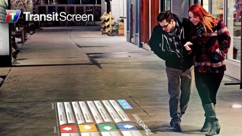 In addition to the real-time transit data provided by the screens, the projections would also embed way-finding information for transit options on sidewalks, walls, plazas, or even billboards.