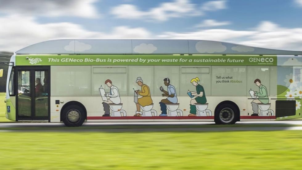 The Bio-Bus can travel up to 186 miles on a full tank of gas, which takes the annual waste of around five people to produce.