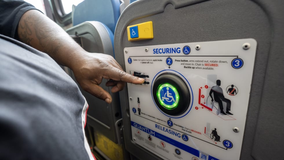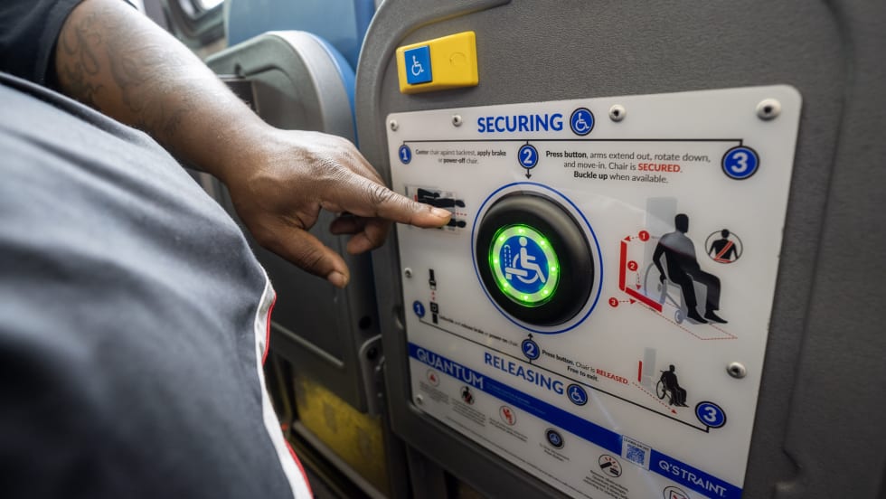 The system is designed to allow people using manual or power wheelchairs to independently secure themselves on a bus with just the push of a button.