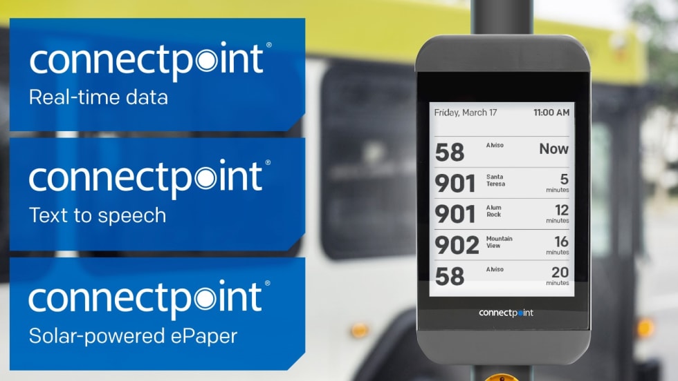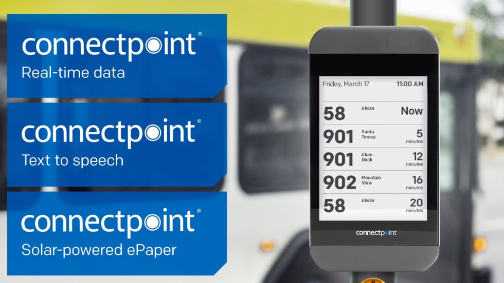 Connectpoint's suite of solar-powered, ePaper digital signage products broadcast real-time arrivals, alert messaging, and customized campaigns.