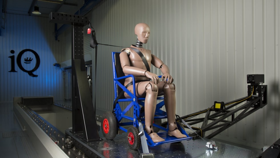The facility features state-of-the-art technologies such as a HYGE crash simulation system and Phantom high-speed cameras to help study the dynamics in a crash environment as they relate to wheelchair passengers.
