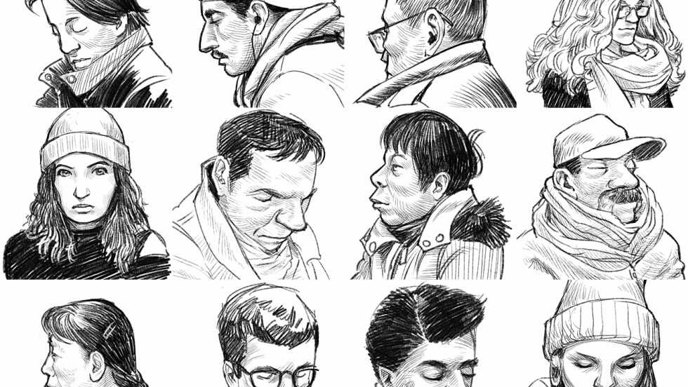 Hamilton Cline says he likes using subject on their phones because they are less likely to look up and around while he draws them.