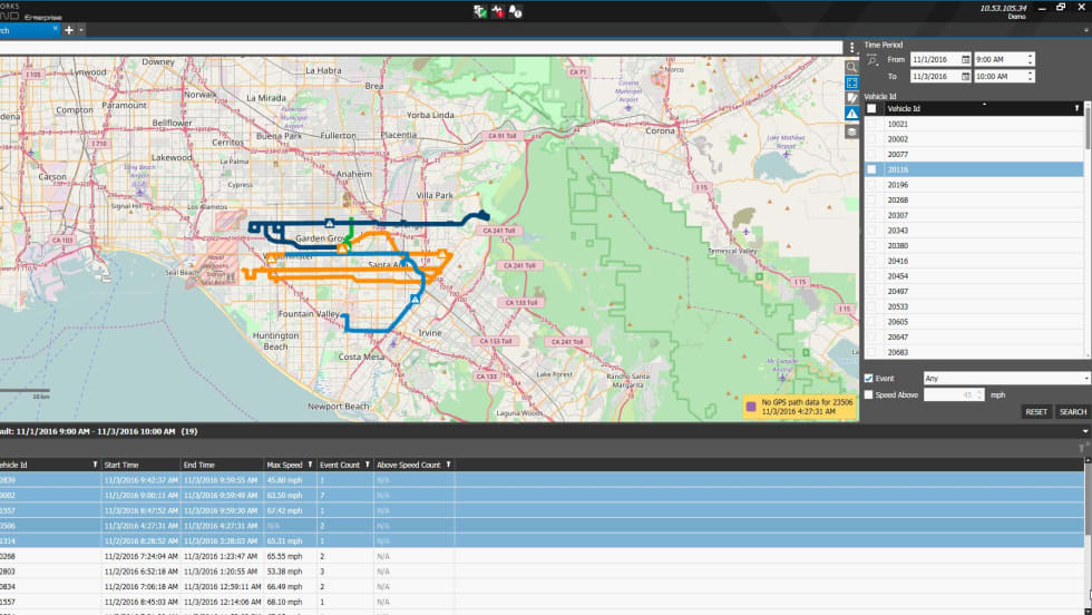 Provides fleet operators with a visual overview of what’s happening on all of their routes, complete with details on recorded events, such as speed, hard brakes, door malfunctions, or impacts.