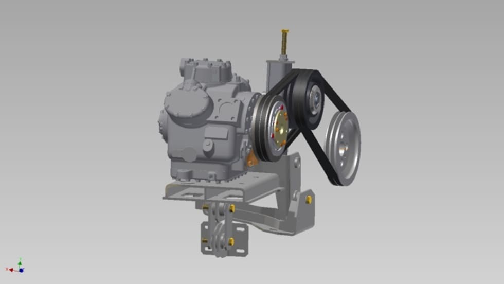 This compressor mount system allows for simple belt tensioning, compressor alignment and reduced vibration, and can be customized for various engine bay layouts and compressors. The major benefits are drastically reduced installation time, reduced belt wear, ease of belt maintenance, and reduced noise and vibration.
