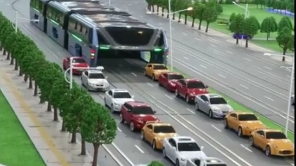 The approximately 6.5-foot high Transit Elevated Bus straddles the cars below, allowing them to pass through. It is able to carry up to 300 passengers in its 72 ft. long and 25 ft. wide body.