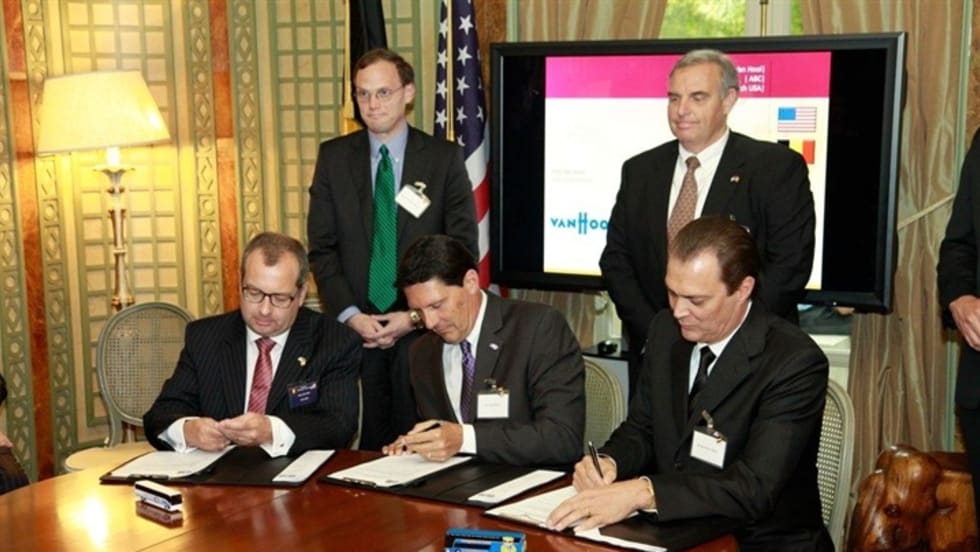 Principals from all three companies participated in a signing ceremony highlighting a key trade agreement between Coach USA and Van Hool.