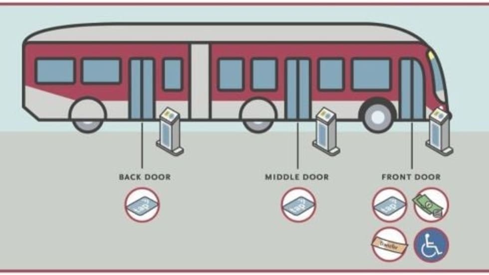 Riders will be able to board at any door of a bus – front, middle or rear – and will pay their fare by using the TAP fare validator installed at each door.
