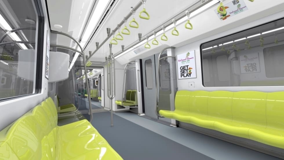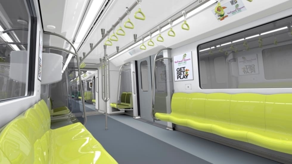 The 213-foot train, composed of 3 cars, has an open gangway allowing passengers to walk from one end of the train to the other. The interior provides a feeling of serenity and security with sections marked in two bright, harmonious colors: green turquoise and lemon used for the seats and the handles, according to the company.