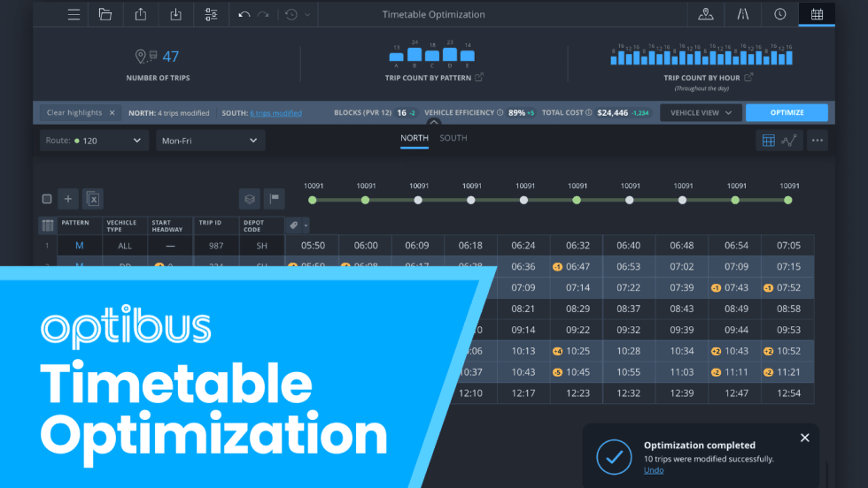 In initial trials of Timetable Optimization, customers saw an additional 5% reduction in required vehicle count, deadheads, and operational expenses.