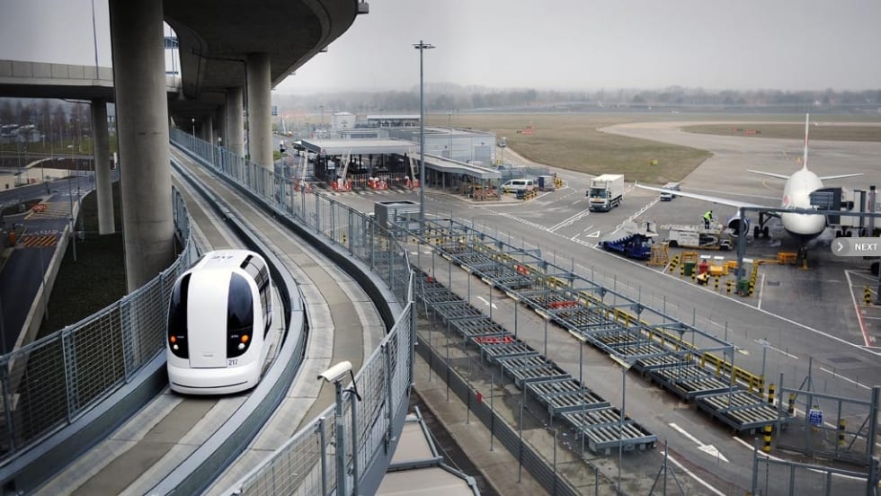 Each pod, which has a battery-powered electric motor, can hold up to two people and their luggage and travels just 12 mph.