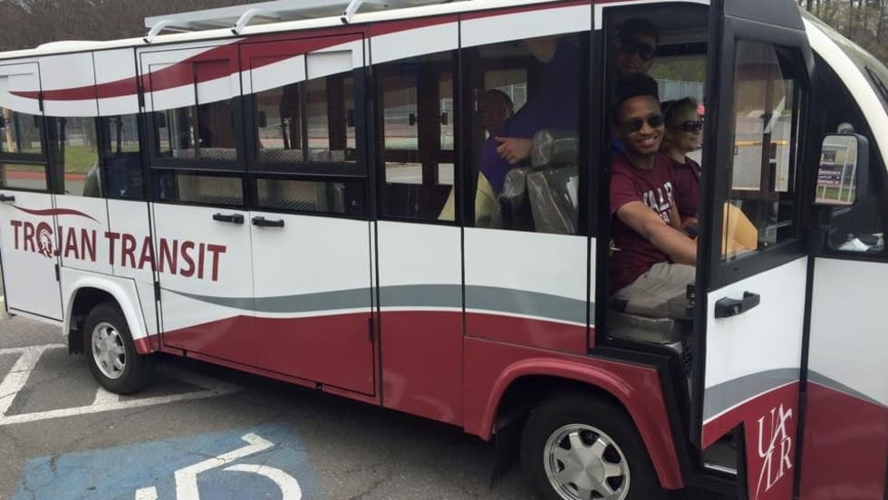 The fleet is made up of three 12-passenger shuttles operating on campus routes and three eight-passenger transit “taxis” that will be driven by campus security.