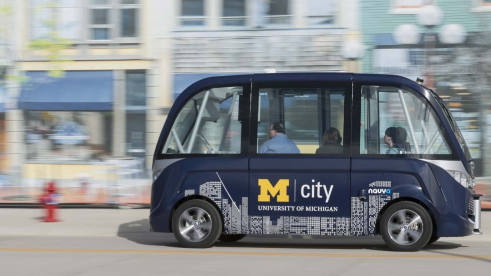 A fully autonomous, 15-passenger electric shuttle manufactured by French firm NAVYA will support research and provide self-guided tours of Mcity, the university's test site for connected and automated vehicles.
