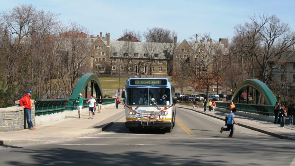 Tompkins Consolidated Area Transit operates 34 routes using a fleet of 55 buses, including eight electric diesel hybrid buses. The system originates from three systems operated by the City of Ithaca, Tompkins County and Cornell University, with each stemming as far back as far as a half of a century.