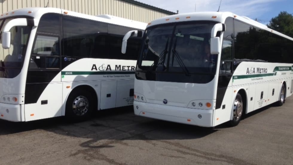All of A&A Metro Transportation's coaches are equipped with a Cummins/Allison drivetrain, and A&A’s coaches also offer quality features, such as 110-volt plugs, Alcoa Dura Bright wheels, an auxiliary preheater, rear camera, a rear window and an Elite REI A/V system.