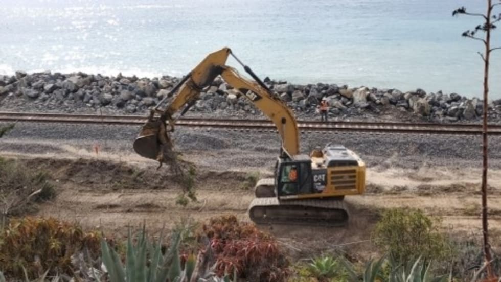 Work will involve drilling large steel anchors more than 100 feet long into the bedrock of the slope adjacent to the railroad track to prevent it from pushing the track further toward the ocean.
